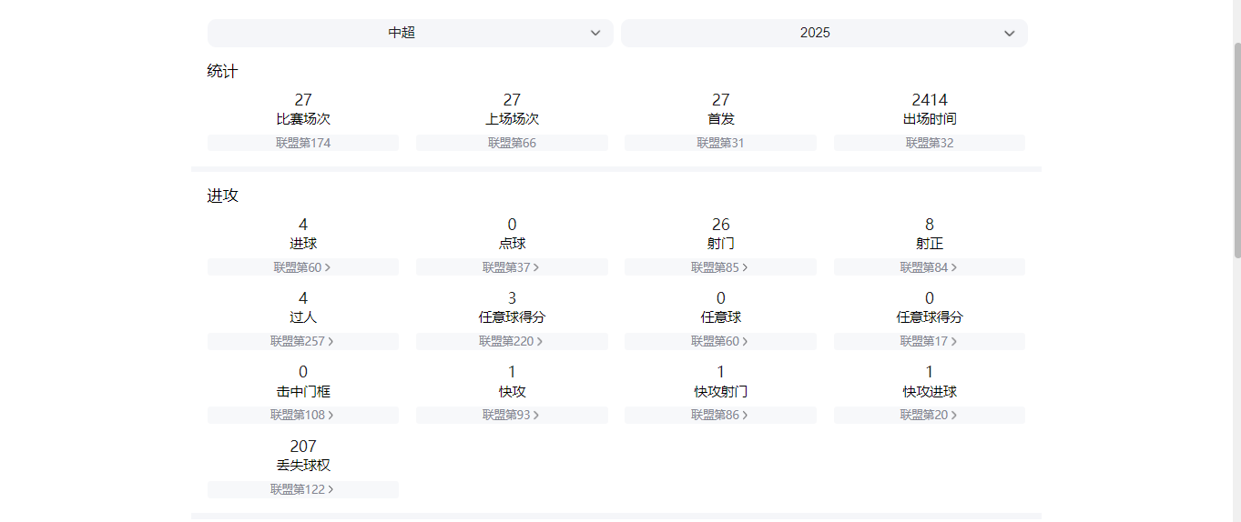截至中超25赛季结束,朴志洙已累计征战联赛5个赛季,期间仅效力过广州队和武汉三镇,还跟随广州队在19赛季荣获联赛冠军。他离开中超的原因是合同到期,有了更好去向,加盟K联赛球队全北现代。
